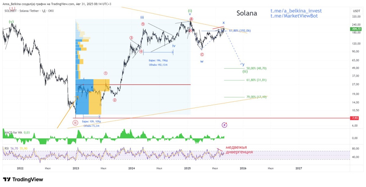 Волна (ii) of [iii] еще не завершена. Наиболее вероятно, сформировалась волна x of (ii) of [iii], откат составил более 61.8%, это троечная структура - MACD это подтверждает (нет всплесков в потенциальных третьих волнах импульса), дневной RSI сформировал медвежью дивергенцию.