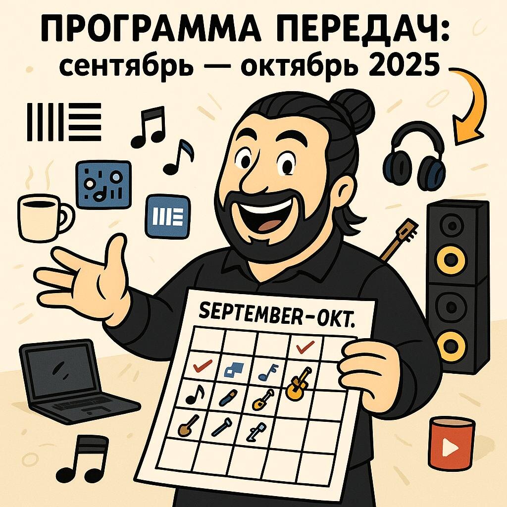 Программа передач: сентябрь — октябрь 2025 3 сентября — Мой любимый плагин: Pultec от UAD 10 сентября — Как отдыхаю от музыки 17 сентября — Как я работаю с референсами 24 сентября — Мини-история из студии YouTube: ?? сентября — Почему не всем нужно делать шоу из своей жизни (и почему это нормально) YouTube: ?? сентября — Ableton для INT 1: Эпизод 10 — Браузер: твой склад звуков 1 октября — Прямая реклама меня и моих услуг ;) 8 октября — Любимый плагин: Ableton Saturator 15 октября — Что я слушаю прямо сейчас 22 октября — Любимый плагин: Glue Compressor от Cytomic 29 октября — Любимый плагин: UAD 1176 YouTube: ?? октября — Почему большинство музыкантов не выживают на рынке: взгляд без иллюзий YouTube: ?? октября — Ableton для INT 1: Эпизод 11 — Session View. Играем в музыкальный конструктор Следите за обновлениями, чтобы не пропустить новые посты и видео. Если есть вопросы или темы, которые хочется разобрать — пишите в комменты или в личку. Подписывайся, чтобы быть в теме!