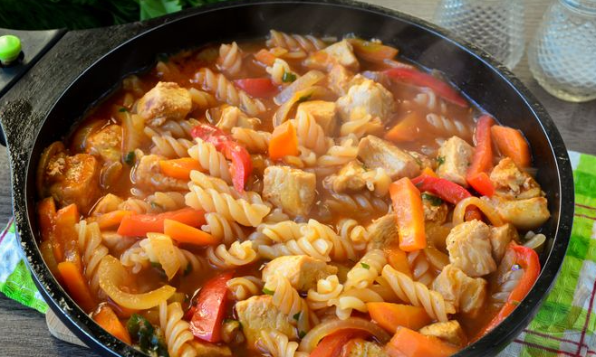 Шаг 1. Подготовьте продукты. Для этого блюда можно взять любую часть свинины, у меня — корейка без костей (она не слишком жирная). Шаг 2. Мясо вымойте, обсушите и нарежьте кусочками среднего размера. Шаг 3. Налейте масло в сковороду, разогрейте его на среднем огне. Положите свинину и обжарьте 3–4 минуты. Затем убавьте температуру до слабого огня и оставьте тушиться под крышкой на 15 минут. Шаг 4. Пока мясо готовится, займитесь овощами. Очистите лук и сладкий перец. Морковь нарежьте брусочками, лук — полукольцами, перец — полосками. Шаг 5. Добавьте лук к мясу, перемешайте и обжарьте вместе 2–3 минуты. Шаг 6. Выложите морковь, снова перемешайте. Шаг 7. Добавьте сладкий перец, хорошо перемешайте. Готовьте овощи со свининой ещё 4–5 минут. Посолите и приправьте перцем. Шаг 8. Влейте томатный сок. Накройте крышкой и тушите мясо с овощами около 25 минут. Шаг 9. Петрушку вымойте, мелко нарежьте и положите в сковороду. Шаг 10. Закипятите 200 мл воды. В сковороду к мясу и овощам высыпь