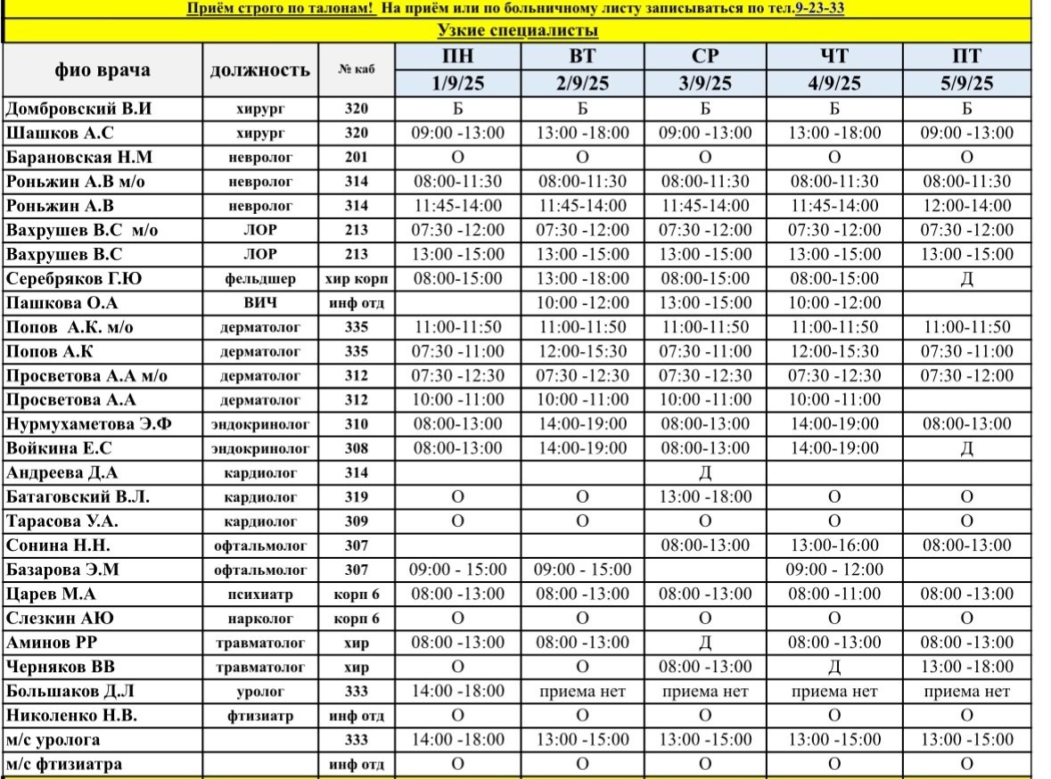 Актуальный график работы врачей с 1 сентября • Городской поликлиники; • Детской поликлиники; • Стоматологической поликлиники; • Женской консультации. Возможны изменения. Уточняйте расписание на официальных ресурсах или по телефону кол-центра: 9-23-33. 👉 Типичный Снежинск