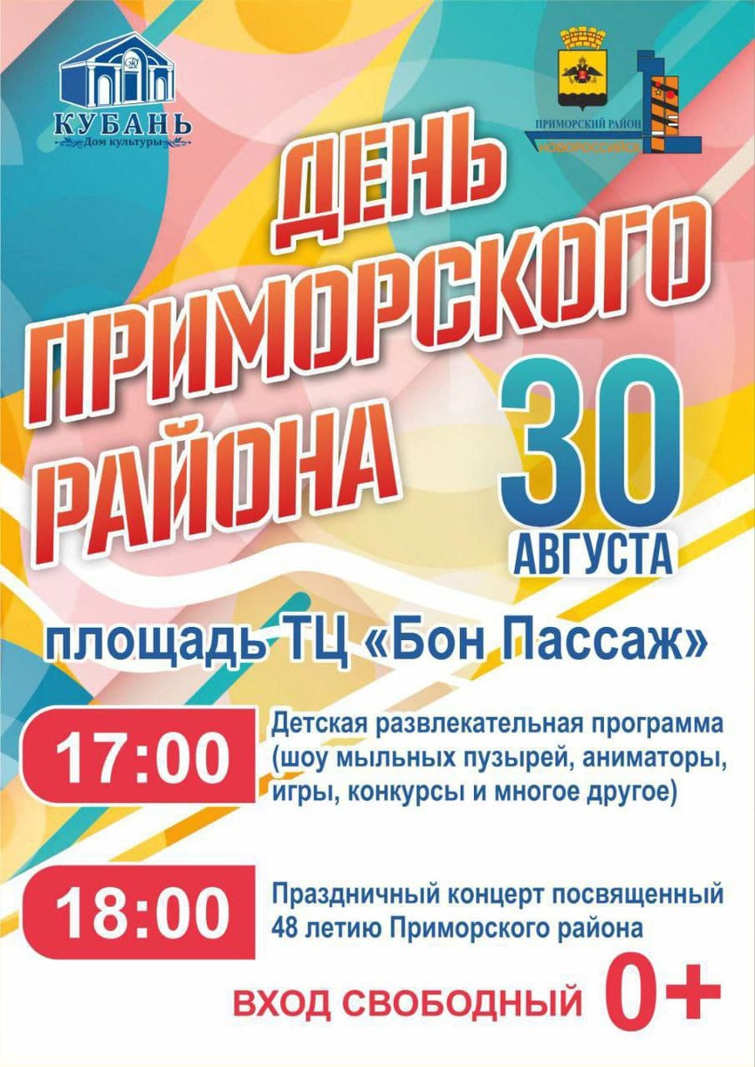 🎉Сегодня, в субботу 30 августа, мы будем ждать всех на общее празднования ДНЯ ПРИМОРСКОГО РАЙОНА. 🎬Сцена уже готова, наши артисты, ведущие, солисты, группы и аниматоры производят последние репетиции и приготовления перед встречей дорогих гостей. Не пропустите, сегодня на площади у Торгового центра «Бон Пассаж»: 🤡🫧Детская программа в 17:00 🎶Большой концерт в 18:00 🕕 Ждем всех, место встречи: площадь у ТЦ «Бон Пассаж». Погоду обещают хорошую ☀️, поэтому не забудьте головные уборы для себя и своих детей при необходимости и воду.