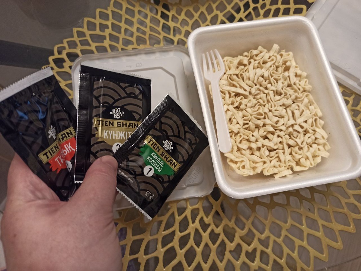 Пасмурно, идет дождь. Настроение такое же. Пошли с мужем в Чижик. Новинки есть каждую неделю или чаще. Иногда бывают прямо таки хорошие скидки (джинсы женские за 199 руб.). Жаль, что точно не знаешь, когда они будут. Муж сказал: Давай новую лапшу быстрого приготовления попробуем? Цена вроде не низкая. Может вкусная. Я согласилась. А почему бы нет? Иногда прям охота этой одноразовой лапши. Лапша Big Bon Wok с 3 пакетиками внутри. На вид не мне понравилась. Я люблю тонкую лапшу. Засыпала сухие овощи, налила немного соуса. На вид он странного коричнево-зеленого оттенка. Залили кипятком, 5 мин. и готов обед. Я еще намазала крем-пасту (кальмар и криль) на хлебец и ела вместо хлеба. Кстати, тоже купили в Чижике. Второй раз не куплю. Как будто слив. масло или маргарин ела. Нет, не люблю я такое. Еще купили корейку из свинины "Папа может". Стоит 179 руб. 300 г. Покупаю уже не раз. Сытно получилось. Но сейчас мне скажут, что надо было самой сварить суп. Так мы иногда только едим такую лапш