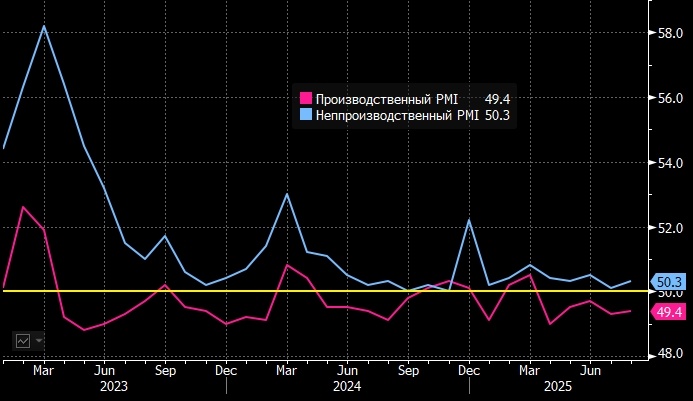 Индекс деловой активности в производственном секторе Китая остается ниже порогового значения 50 пунктов. В то же время индекс деловой активности в непроизводственной сфере ускорился до 50,3 пункта. Согласно официальному опросу, проведенному в воскресенье, производственная активность в Китае сократилась в августе пятый месяц подряд. Это говорит о том, что производители ждут дальнейшей ясности в отношении торговой сделки с США, в то время как внутренний спрос остается вялым. Официальный индекс менеджеров по закупкам (PMI) вырос до 49,4 в августе по сравнению с 49,3 в июле, оставшись ниже отметки 50, отделяющей рост от спада, и не достигнув медианного прогноза в 49,5, полученного в ходе опроса Reuters. Экономика Китая сталкивается с ослаблением экспорта из-за американских пошлин, спада в секторе недвижимости, растущей нестабильности в сфере занятости, высокой задолженности местных органов власти и экстремальных погодных условий. По мнению экономистов, эти факторы грозят сорвать достижение