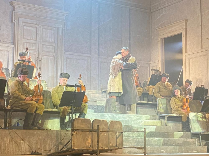 Первыми на сцене появились музыканты ансамбля «Солисты Москвы», облаченные в гимнастерки и ушанки. В бурных овациях искупали новороссийцы появившегося следом народного артиста СССР, дирижера Юрия Башмета. Он вышел в шинели и в последствии, как говорится, «по ходу пьесы», актеры обращались к нему, как к генералу.