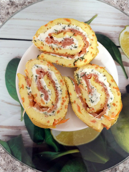 Когда рулет остынет, перевернуть его и намазать сыром, смешанным с нарубленной зеленью. Сверху укладываем тонкие кусочки рыбы или ветчины, заворачиваем, и в холодильник на часок.
