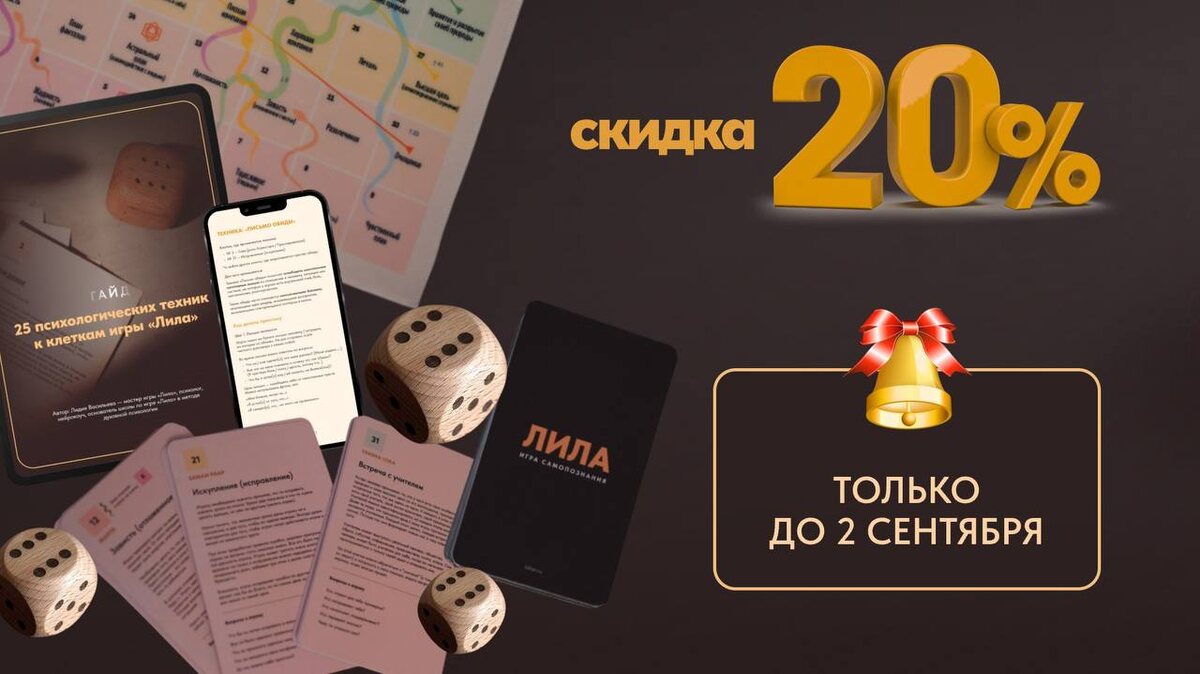 🎓 Специальная акция к 1 сентября — скидка 20% на все товары для проводников Лилы 1 сентября напоминает о том, что процесс обучения бесконечен. Каждый проводник Лилы всегда в поиске инструментов, которые помогают глубже раскрывать игру и работать с участниками. В честь этого дня действует редкая возможность — 20% скидка на все товары в магазине для проводников: — онлайн и офлайн наборы — поля разных размеров (от маленького до напольного) — карты игры Лила — гайд с 25 психологическими техниками к игре — а также консультация по маркетингу. 📅 Срок действия акции: только 31 августа и 1 сентября 2025 года. 🔑 Промокод: UROK Пусть эти инструменты станут поддержкой в работе и помогут каждому проводнику сделать практику ещё глубже и сильнее. КУПИТЬ СО СКИДКОЙ 👉 https://lidiav.ru/lilashop