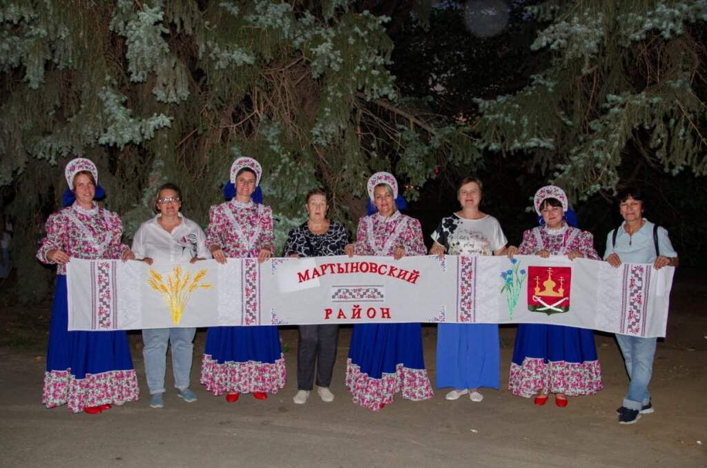 22 августа в День государственного флага Российской Федерации в парке им. Красных Партизан состоялось праздничное мероприятие, были организованы тематические площадки, выставки, мастер-классы. В торжественной обстановке Глава Администрации Мартыновского района О.В. Дьяконов вручил паспорта молодым гражданам. Особенностью вечера была демонстрация рушника Мартыновского района длиной 4,5 метров. Декоративное полотенце было изготовлено в рамках областного фестиваля декоративно-прикладного искусства «Донской рушник». С целью популяризации традиционных ремесел как культурного достояния Донского края местные мастера Бушуева Елена Евгеньевна, Кутнях Любовь Александровна, Попова Ольга Анатольевна, Склярова Наталья Владимировна вышили такой рушник всего лишь за один месяц. На нем изображены геральдические знаки и символы Мартыновского района в технике вышивки крестиком и лоскутной аппликацией. Уже расшитое полотенце сшил и дополнил коллектив районного Дома культуры. Изделие будет представлено на
