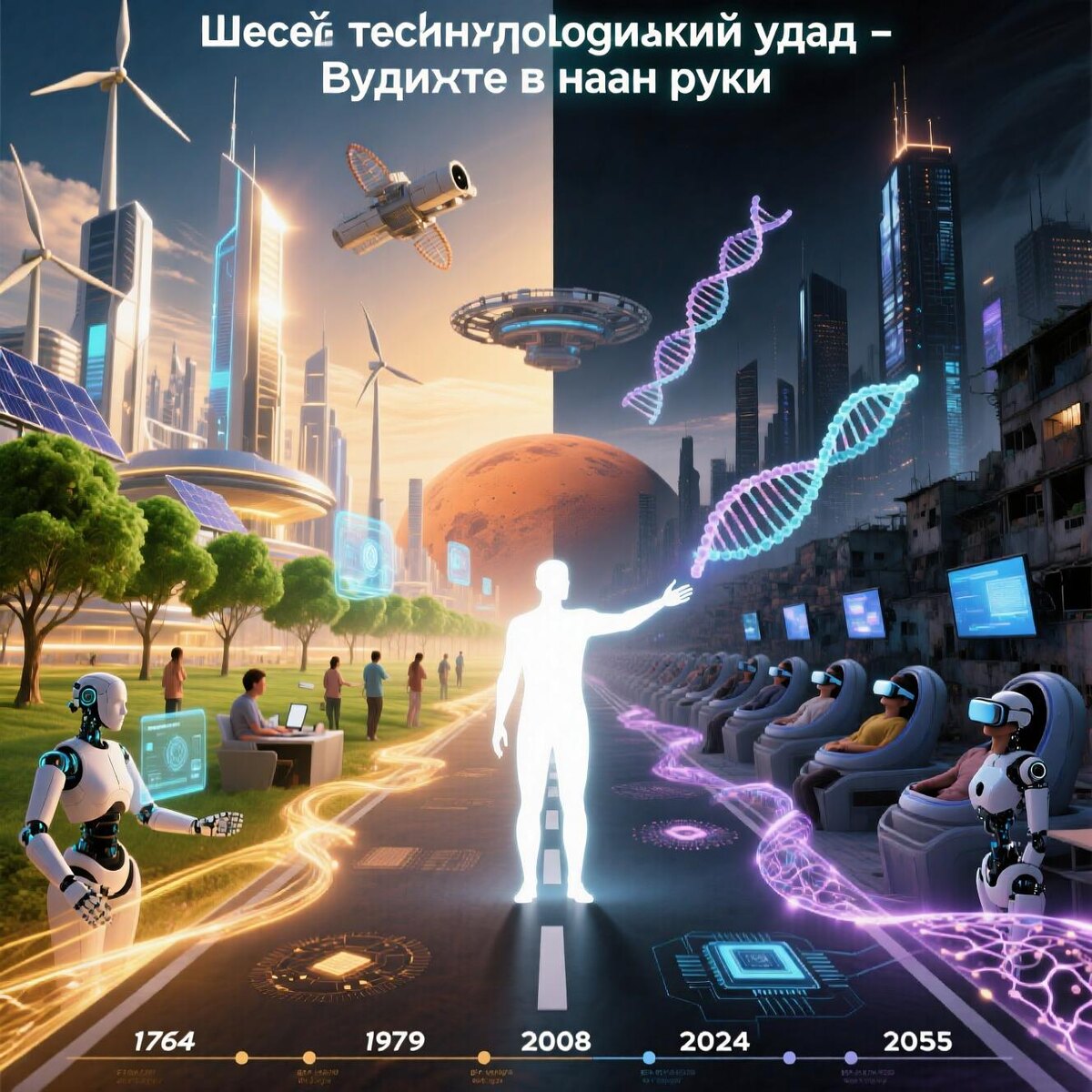 Человечество находится на пороге новой эпохи. Всё, что раньше казалось фантастикой, становится реальностью. Искусственный интеллект, генная инженерия, квантовые компьютеры и нанотехнологии — эти технологии уже меняют нашу жизнь, а в ближайшие десятилетия могут полностью изменить саму природу человека. Это шестая технологическая революция, и она уникальна тем, что развивается с невиданной скоростью и объединяет усилия разных направлений, усиливая друг друга. В 1920-х годах русский экономист Николай Кондратьев обнаружил, что развитие экономики происходит волнами — каждые 40–60 лет человечество переживает технологическую революцию, которая кардинально меняет образ жизни. Позже Йозеф Шумпетер назвал этот процесс «творческим разрушением»: новые технологии уничтожают старые отрасли, но создают новые возможности. Сегодня мы стоим на пороге шестого технологического уклада — эпохи, в которой технологии не просто меняют способы производства или общения, а начинают менять саму биологическую суть