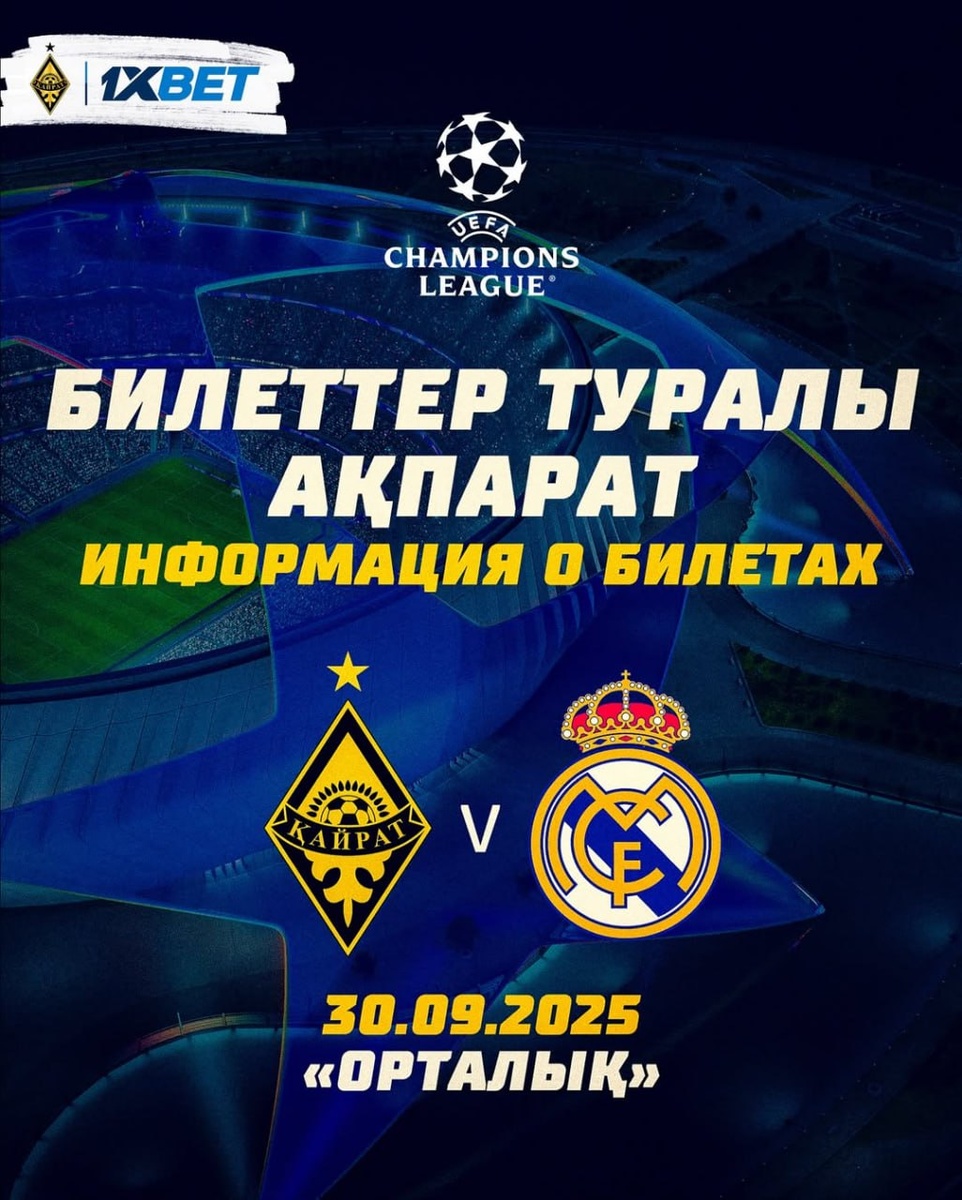 В ответ на пост Футбольный клуб "Кайрат" сделал заявление о продаже билетов на матч с "Реал Мадридом" В клубе отмечают, что любая информация, распространяемая в социальных сетях о продаже или бронировании билетов на игру «Кайрат» — «Реал Мадрид» – ложная. "Единственными официальными источниками информации о билетах являются сайт клуба и официальные аккаунты ФК «Кайрат» в социальных сетях", – говорится в официальном заявлении. В клубе предупреждают, что даты старта продаж билетов и цены на них ещё не определили. Болельщиков просят не доверять сторонним объявлениям и не совершать покупки через неофициальные каналы. Фото: Instagram/f.c.kairat ✍️Подписывайтесь на t.me/CMN_KZ
