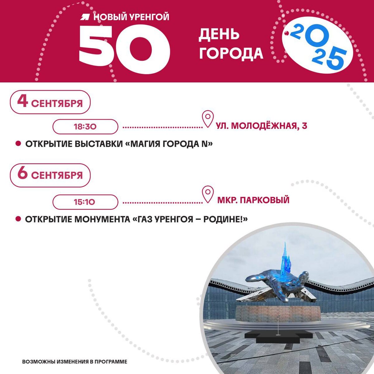 ♥️Афиша мероприятий на самый яркий #Юбилей_для_людей В первые выходные сентября Новый Уренгой отметит День города и День работников нефтяной и газовой промышленности. Но праздновать начнём заранее — с 4 сентября! В этом году мероприятия традиционно развернутся на Интернациональной улице и городской площади, но появятся и новые локации с тематическими площадками — проезд Народов Севера и озеро Молодёжное. Творчество, активности, песни, танцы, ярмарки и много-много вкусного — #НУР_юбилей50 поразит вас в самое сердце! Сохраняйте программу праздника, пересылайте друзьям и знакомым. Ждём и предвкушаем! ❤️ НУР. Официально