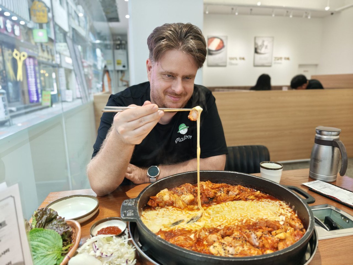На обед мы решили оторваться по полной! Dakgalbi это сковорода с дорожкой моцареллы и кимчи с курицей по бокам 😁 Можно добавить всякие дополнительные вкусняшки в сковородку, по типу сосисок, дополнительного сыра, рис или лапшу 🙈 Мы решили что блюдо и так прекрасно и ели его с листочками шелковицы🔥🔥🔥 Очень вкусно Мега круто И не очень остро (мы выбрали самый минимальный уровень острости) как же мы объелись 😅 #Пусан #ПутешествиеВПусан #ЮжнаяКорея #ОтдыхВКорее #Пусан2025 #ПоездкаВКорею #постранам #постранамсоняибоб