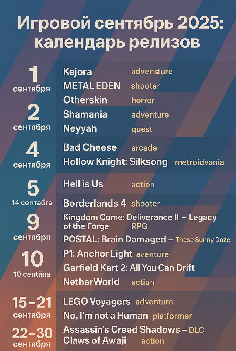 💡 Вывод: сентябрь 2025 — это месяц, в котором каждый найдёт что-то для себя: от масштабных ААА-проектов до уютных инди. И, судя по списку, геймерам придётся серьёзно планировать время, чтобы успеть всё попробовать.