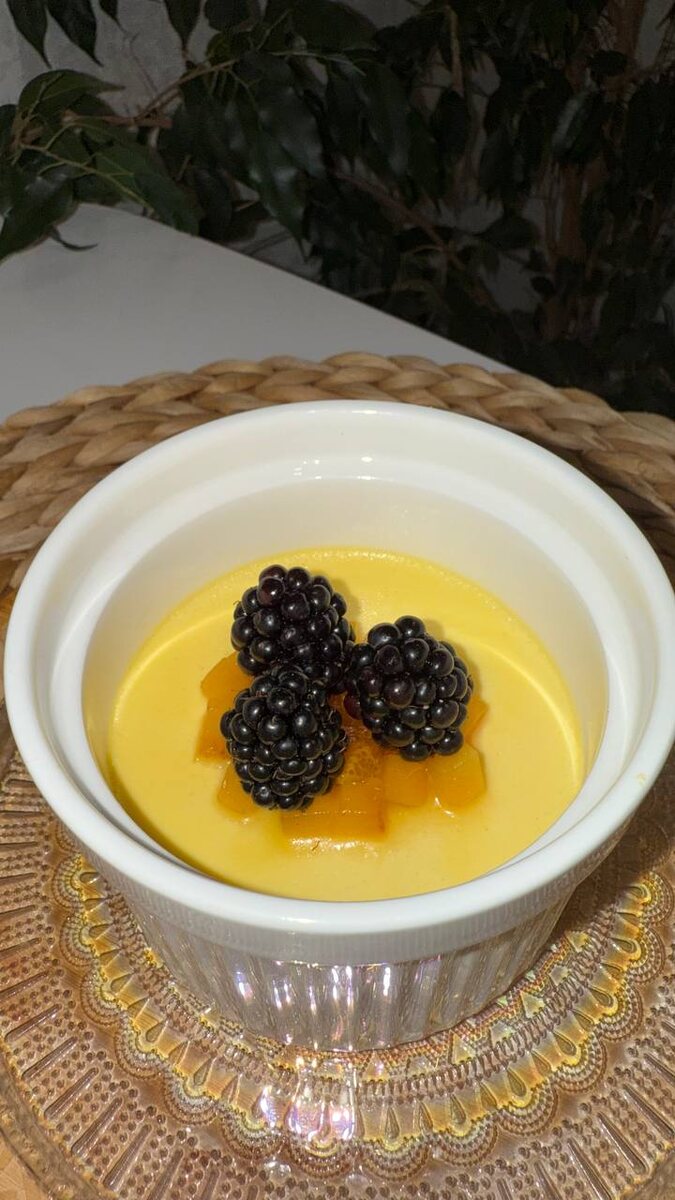 Crème brûlée (Крем-брюле) Нежный, с идеально шелковистой текстурой и изысканным вкусом. Дополнен сочными кубиками спелого персика, свежей ежевикой и лёгкой ноткой цитрусовой цедры. Сладость крема тонко уравновешена лёгкой кислинкой ягод и цитрусового аромата. #dessert