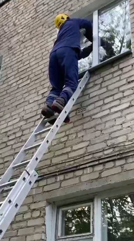 Владельцы квартиры на втором этаже дома по ул. Шафиева ушли, оставив приоткрытой створку современной рамы. Сетки на окне не было, и этим не преминула воспользоваться кошка — и беспомощно повисла в клиновидном проёме. Это очень опасная ситуация — если не помочь, животное медленно и мучительно погибнет, задохнувшись и выбившись из сил.
