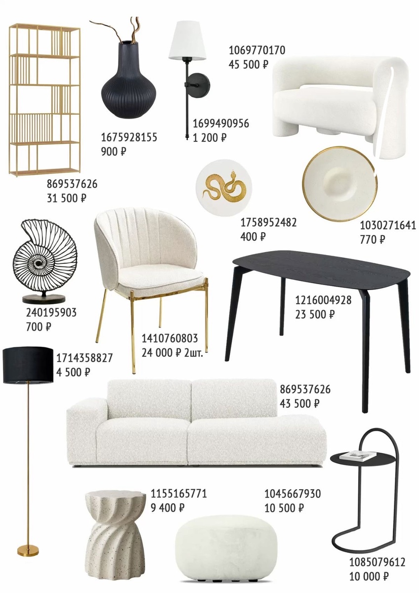 Современный интерьер строится не на «дорогих вещах», а на сочетании линий, фактур и оттенков. На коллаже — готовая капсула для гостиной-столовой в палитре чёрный графит + латунь + айвори/букле + натуральный камень. Я разобрала каждый предмет по порядку, как на изображении, прикрепила цены и кликабельные артикулы (жмите на номер — попадёте на карточку товара на Ozon), а ещё добавила точные подсказки по расстановке и сочетаниям.