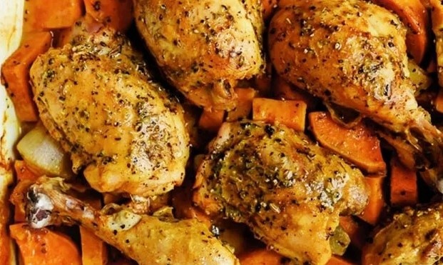 - Запекайте 35-40 минут, пока курица не станет золотистой, а батат — мягким.