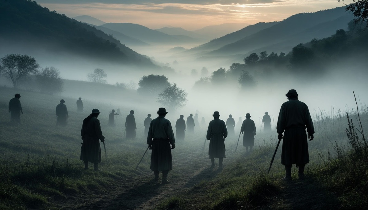 Внезапно туман впереди сгустился, и из него стали проступать очертания. Не одна, а несколько фигур. Они медленно двигались, занятые какой-то невидимой работой. Одни словно косили траву серпами, другие несли вязанки хвороста. Это были призрачные изображения крестьян XVIII или XIX века. Они не обращали на Анну никакого внимания, были полностью поглощены своим вечным, бессмысленным трудом.
