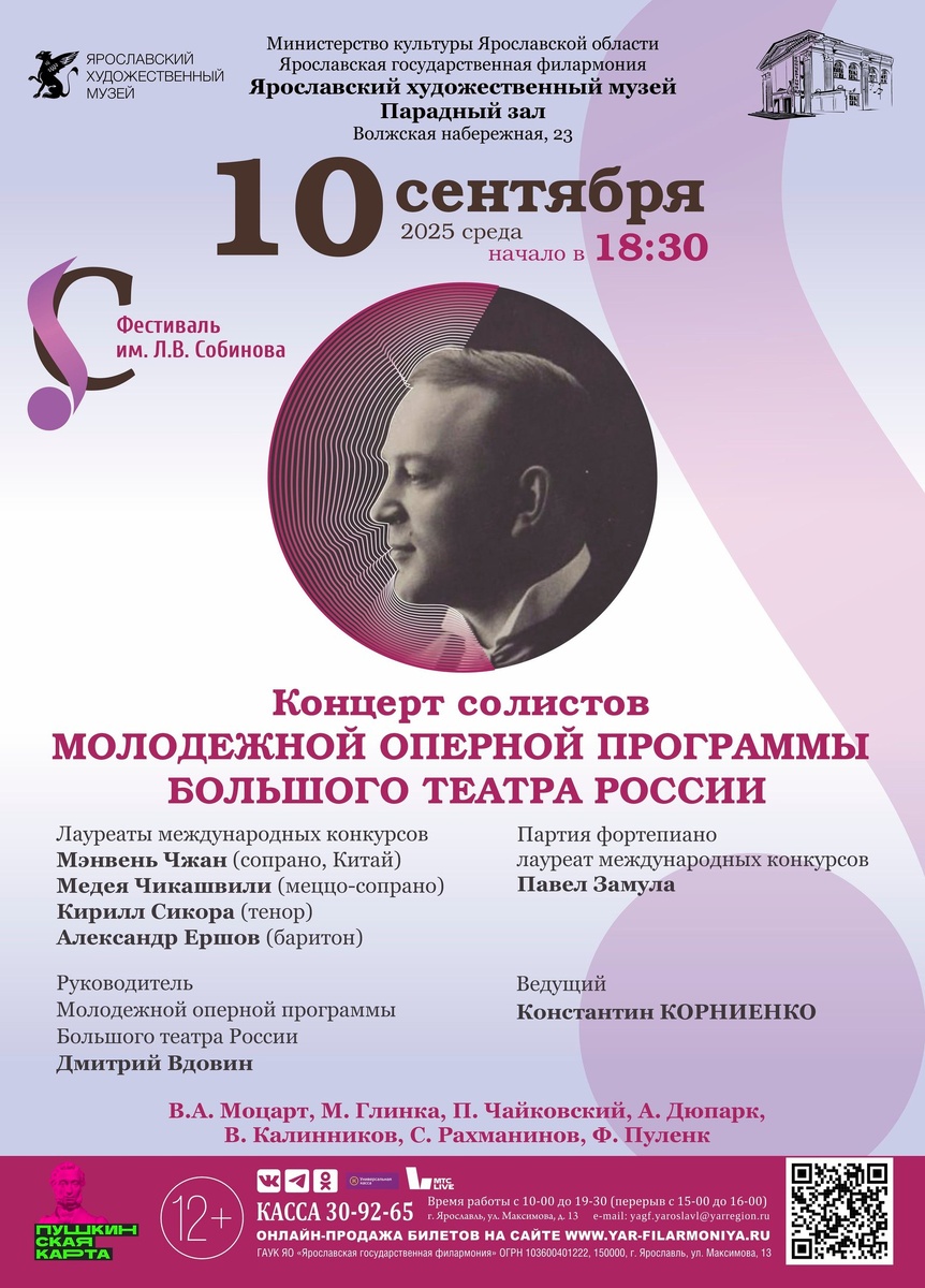 Приглашаем насладиться шедеврами вокальной музыки в исполнении молодых талантливых певцов! 10 сентября 2025 г. в Парадном зале Ярославского художественного музея состоится концерт солистов Молодежной оперной программы Большого театра России. Концерт пройдет в рамках Фестиваля имени Л.В. Собинова. 🌐 https://clck.ru/3NgpWQ Лауреаты международных конкурсов Мэнвень Чжан (сопрано, Китай), Медея Чикашвили (меццо-сопрано), Кирилл Сикора (тенор) и Александр Ершов (баритон) исполнят вокальные сочинения В.А. Моцарта, М. Глинки, П. Чайковского, А. Дюпарка, С. Танеева, В. Калинникова, С. Рахманинова, С. Прокофьева, Ф. Пуленка, А. Животова. Партия фортепиано - лауреат международных конкурсов Павел Замула. Ведущий – Константин Корниенко. Молодежная оперная программа была создана в Государственном академическом Большом театре России в октябре 2009 г. Художественный руководитель – Дмитрий Вдовин. Участники программы проходят курс профессионального усовершенствования. Каждый из них имеет обширную сцен