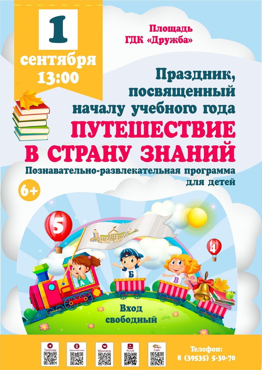 1 сентября в 13:00 Дворец культуры «Дружба» приглашает ребят на праздник «Путешествие в Страну Знаний».