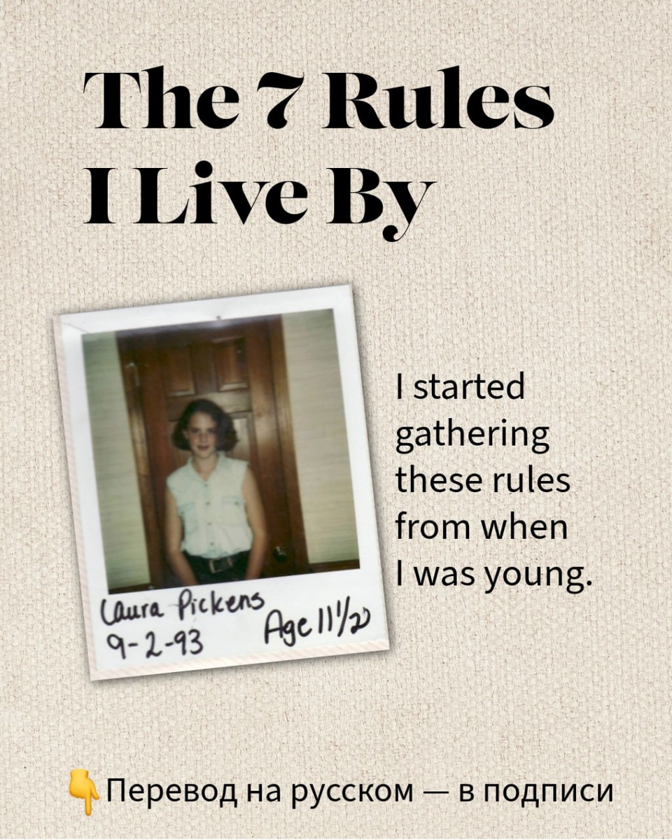 7 правил, по которым я живу Я начала собирать эти правила ещё в юности. 1. Самый важный вопрос, который ты можешь себе задать — ЧЕГО ТЫ ХОЧЕШЬ? У меня почти нет сожалений в жизни, потому что я всегда хотя бы немного понимала, чего хочу. И даже когда становилось трудно, я знала — я там, где сама захотела быть. 2. Когда не знаешь, что делать — не делай ничего. Когда я перегружена, у меня появляется сильное желание действовать. Но в такие моменты я думаю не ясно и часто принимаю плохие решения. Если я чувствую себя так — мне просто нужно остановиться. 3. Крути, не тяни. Если что-то застряло — не рви изо всех сил, попробуй покачать в разные стороны. Если ты в конфликте — не лезь на пролом, а подойди к ситуации с другой стороны. 4. Будь гибкой. Когда мне было 15, это правило дали нам, студентам по обмену в Германии. Мы попадали в новые места, новые обычаи. Всё было не так, как мы хотели или ожидали. Но если ты расстраиваешься — ты упускаешь всё весёлое. 5. Мир — хорош для бизнеса. Вой