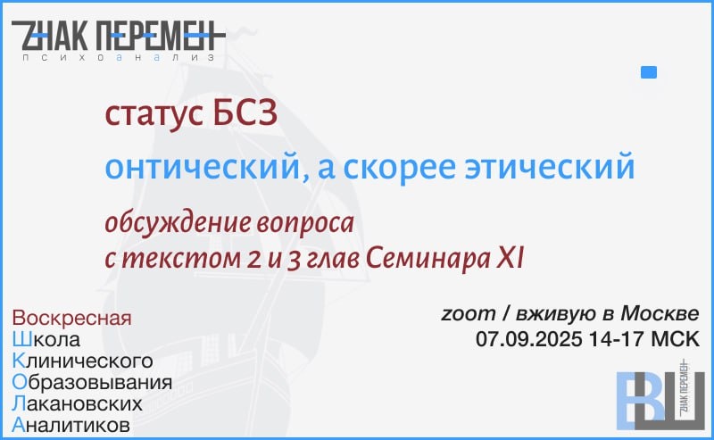 ⚡️ в вс. 7 сентября в zoom [и вживую в Москве] с 14 до 17 МСК состоится первая в новом учебном году открытая встреча ВШ 🔹 темой основного доклада и обсуждения станет вопрос статуса бессознательного, рассмотренный Лаканом на 2 и 3 встречах Семинара XI тезисную канву доклада см. в публикации ниже 🔹 кроме основного доклада и обсуждения будет место для речи слушателей ВШ, а также будет анонсирована программа ШКОЛЫ на следующий учебный год, где на этот раз есть возможность присоединиться к семинарам французских аналитиков ⭐ формат ВШ задуман для со-держания речи и знакомства, как наиболее открытая приветственная площадка нашей Школы. Мы будем рады как полным нулям, так и не совсем пустым множествам багажей и знаний. В этом проекте мы ищем экзотерические пути представления ПА, короче, пробуем говорить ясно и по делу с пользой для любой аудитории. 🏹 поделитесь, пожалуйста, этим анонсом с теми, кто ищет путный разговор о теории и практике лакановского анализа 📌 информация о том как