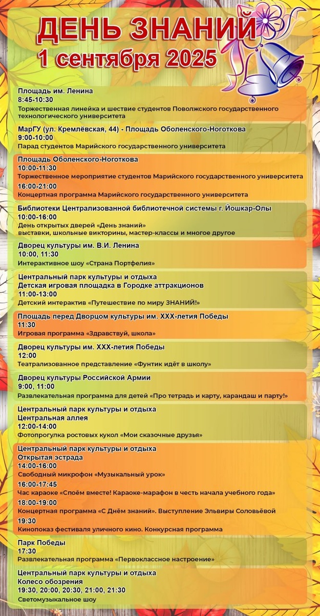 🍁 1 сентября на площадках Йошкар-Олы для школьников пройдут праздничные мероприятия