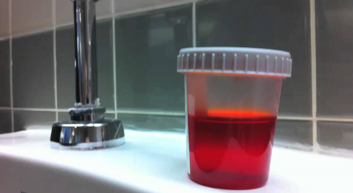 - Макрогематурия. Видимая кровь в моче, особенно если она ярко-красная или содержит сгустки.