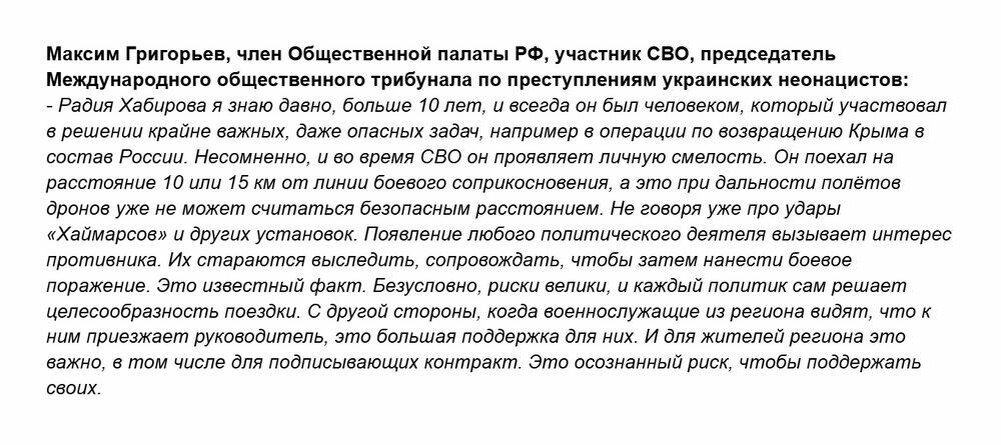Максим Григорьев, член Общественной палаты РФ, участник СВО, председатель Международного общественного трибунала по преступлениям украинских неонацистов, прокомментировал визит Главы Республики Башкортостан Радия Хабирова в зону проведения специальной военной операции. Напомним, как сообщалось ранее, 30 августа Глава Республики Башкортостан Радий Хабиров посетил зону проведения специальной военной операции. Радий Хабиров в зоне СВО посетил военнослужащих из Башкирии Эксперты о визите Главы Башкирии в зону СВО