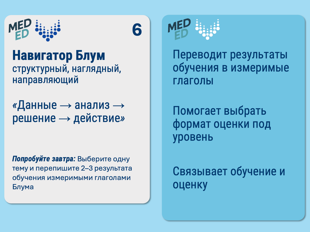 Блум — про когнитивную глубину; Миллер — про уровень демонстрации компетентности («знает», «знает как», «показывает как», «делает»). Для практических навыков цели «применяет/анализирует» логично добивать через ОСКЭ (показывает как) и Оценку на рабочем месте (делает). Это повышает валидность вывода о реальной готовности.