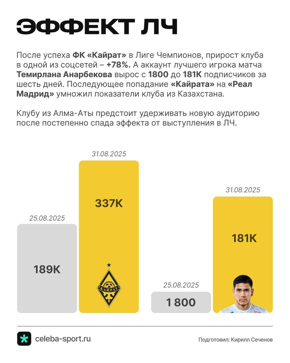 Вау-эффект. За пять дней у казахстанского ФК «Кайрат» +160 тыс. новых подписчиков. А аккаунт вратаря клуба Темирлана Анарбекова взлетел в 100 раз: с 1800 до 181 тыс. подписчиков. Такой эффект от исторического попадания «Кайрата» в Лигу Чемпионов и звездного часа голкипера в решающих матчах. Теперь казахстанскому клубу выпала игра с мадридским «Реалом», что еще сильнее повлияло на узнаваемость «Кайрата» и рост соцсетей. ПРО маркетинг в спорте