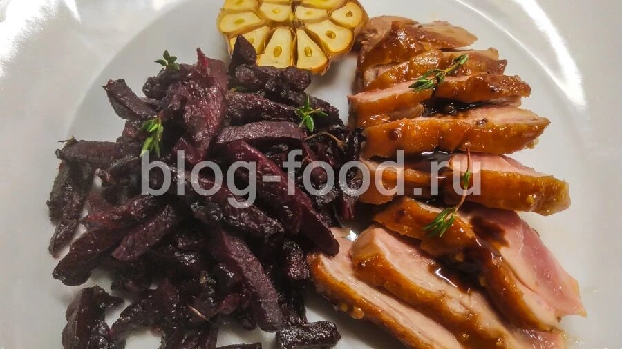 Свёклу режем ломтиками, чеснок поперёк пополам, листочки тимьяна и шалфея отделяем от стеблей, слегка рубим. Выкладываем чеснок и свёклу на противень, присаливаем по вкусу, поливаем растительным маслом, отправляем в духовку на 180°С до мягкости свеклы (25-30 минут). Ставим сковороду на средний огонь, кладём утку кожей вниз, не трогаем семь минут. Солим, перчим по вкусу, переворачиваем, добавляем в сковороду горчицу с мёдом, готовим 3 минуты, обмакивая в ней утку, снимаем с огня. Режем утку ломтиками и подаём с запечённой свёклой и чесноком. Приятного аппетита!