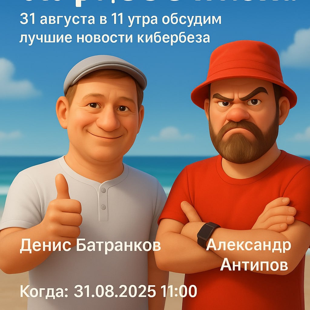 Кофе, SOC и логи. Обсуждение лучших новостей инфобеза за неделю. Внезапно сегодня 31 августа в 11 утра обсудим лучшие новости кибербеза. Денис Батранков, директор по развитию бизнеса группы компаний Гарда, автор телеграм-канала Топ Кибербезопасности, евангелист NGFW и создатель конференции "Сетевая безопасность". Александр Антипов, главный редактор SecurityLab.ru. Каналы @seclabnews. @Antipov_pipiggi. Когда: 31.08.2025 11:11 Трансляция будет здесь: stream.itradio.su
