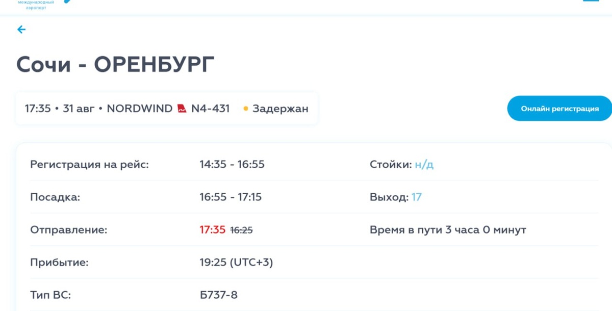 Несколько рейсов задерживаются на вылет и прилет в аэропорту Сочи. Самолет в Оренбург также вылетит с опозданием Это следует из данных онлайн-табло авиагавани. Задержки наблюдаются как по внутренним, так и международным направлениям с вечера 30 августа. В Оренбург самолет вылетит на час позже: не в 16:25, а в 17:35 (мск). Прилет запланирован на 22:30 (орб).