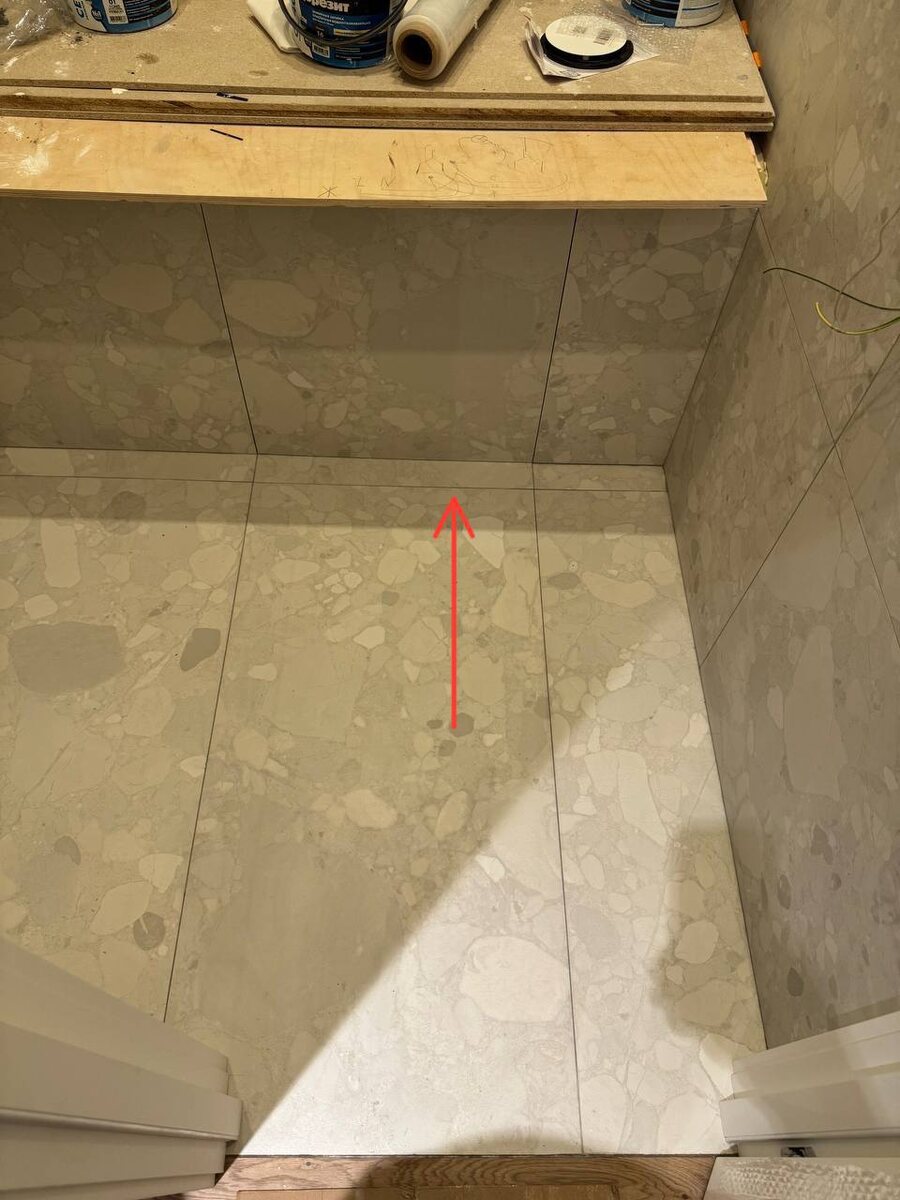 Рубрика #какделатьненадо@ProroomsMariaRozhkova Данный проект заказчики реализовали без моего авторского сопровождения Здесь не проследили откуда строители начали раскладку напольной плитки ‼️В проекте обязательно на плане напольного покрытия всегда указано направление раскладки. ▪️В данном случае раскладка должна идти ОТ ванны к входу, чтобы подрезка уходила к входу. Здесь же получилась тонкая полоска у ванны, которая сильно бросается в глаза, потому что укладывать плитку начали не от туда🙄☹️ 🙏Поэтому даже когда есть проект, контроль никто не отменял!!