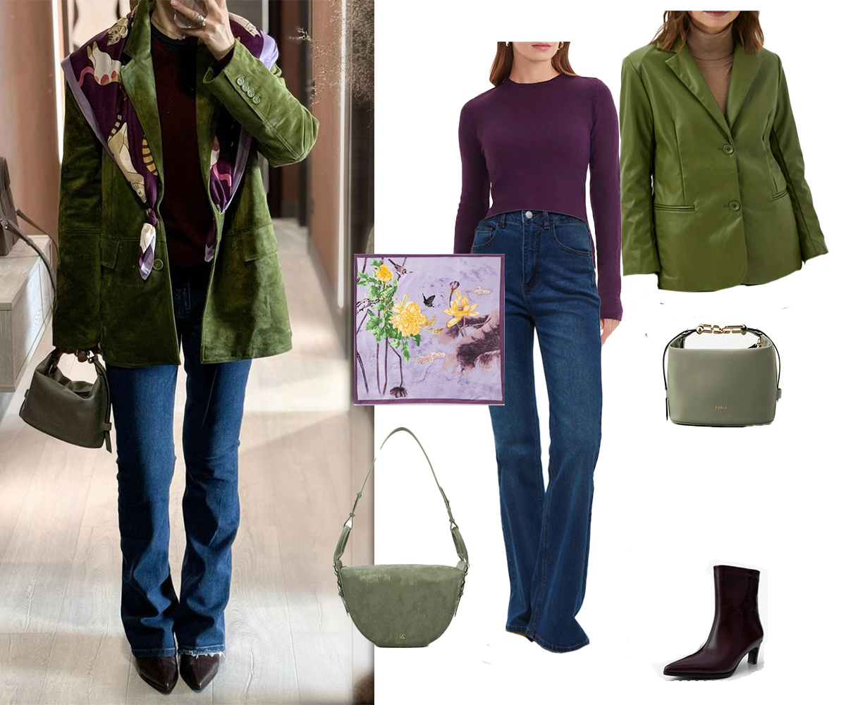 Осень наступила - и это не повод грустить, а причина продумать классные аутфиты и носить их с удовольствием. А я вам в этом помогу - покажу понравившиеся мне на Пинтересте образы с джинсами и похожие на них, которые я собрала на Lamoda - чтобы вы смогли легко повторить, если что-то из этой подборки вам пришлось по вкусу. Наверно, это мое любимое сочетание на данный момент - сливовый с травянистым зеленым. Это как глоток свежести в грядущих пасмурных днях. По фактурам здесь тоже здорово получается: трикотаж, деним,замша, гладкая кожа. Жакет в замше этого классного цвета не нашелся, но разница фактур у нас за счет одного из вариантов сумки, которая большего размера. По при желании и с сумкой как в оригинале тоже хорошо получится. Нам нужно: Жакет - все же цветная кожа или экокожа очень здорово смотрятся, не хуже, чем замша, при этом практичнее. Джинсы. Если не любите широкие или прямые, а скинни все же не так универсальны (да и актуальность их очень непостоянна), то обратите внимание на