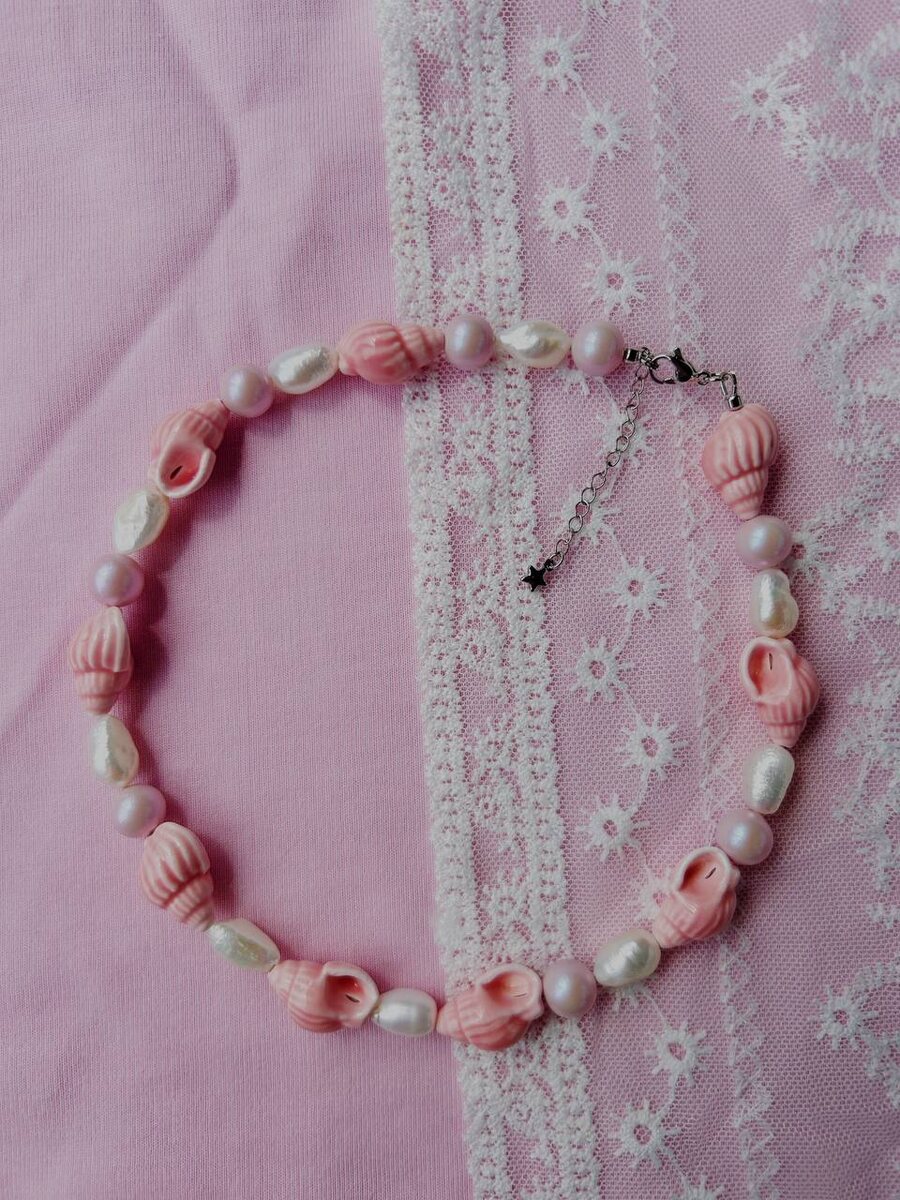 Колье «Розовое море»- колье из розовых ракушек из керамики, натурального жемчуга и жемчуга Майорка
