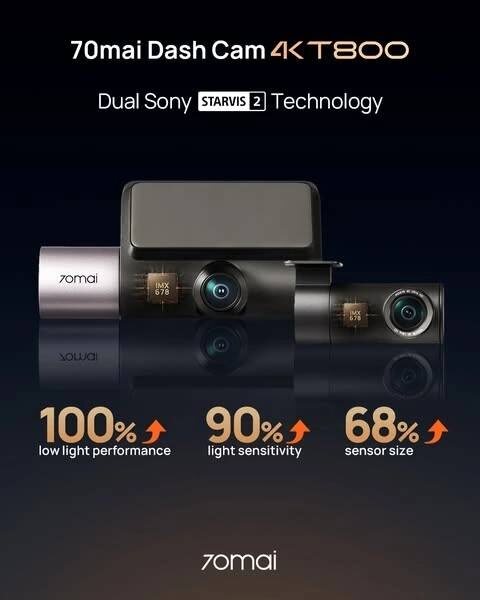 Одна 4K-камера — это хорошо, но мы сделали больше. Теперь Dual 4K. Сенсоры Sony IMX678 STARVIS 2 установлены и на передней, и на задней камере. Благодаря этому #70mai4KT800 снимает с повышенной детализацией, улучшенным ночным видением и стабильным качеством изображения при любом освещении. 🔗 Подробнее тут: eu.70mai.store/products