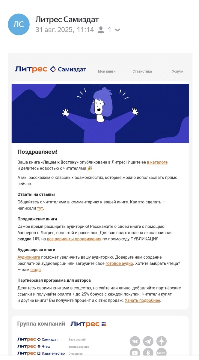 Ну вот и случилось. Первая книга, 3 авторских листа (один а.л., или алка, это 40 тысяч знаков с пробелами). Выбирал для старта ЛитРес, который даёт сервис а-ля самиздат, SelfPub — Интернет при поиске по этому названию чаще выдаёт сервис по самоналиву пива... Само-паб. Ну, допустим, это отражение нашей действительности и лакмусовая бумажка расстановки приоритетов общества, но хочется надеяться, что это лишь маркетинговые продвижения того, кто больше заплатил. Пока писал, пока форматировал, редактировал, собирал и прокрастинировал по поводу и без, смотрел (от лени и любопытства) на рекомендации от литреса, что делать, как готовить, а толчком стало... Да много чего стало. Но вот наконец отправил на модерацию, ждал обещанных три дня и три ночи — и ничего. Висела надпись, что модератор ещё не взял книгу в модерацию. Думал даже написать в чат, но решил подождать ещё, и вот пришёл заветный ответ! Ваша книга не прошла модерацию! Упс! Но ничего страшного, оказывается, надо было на обложке (сге
