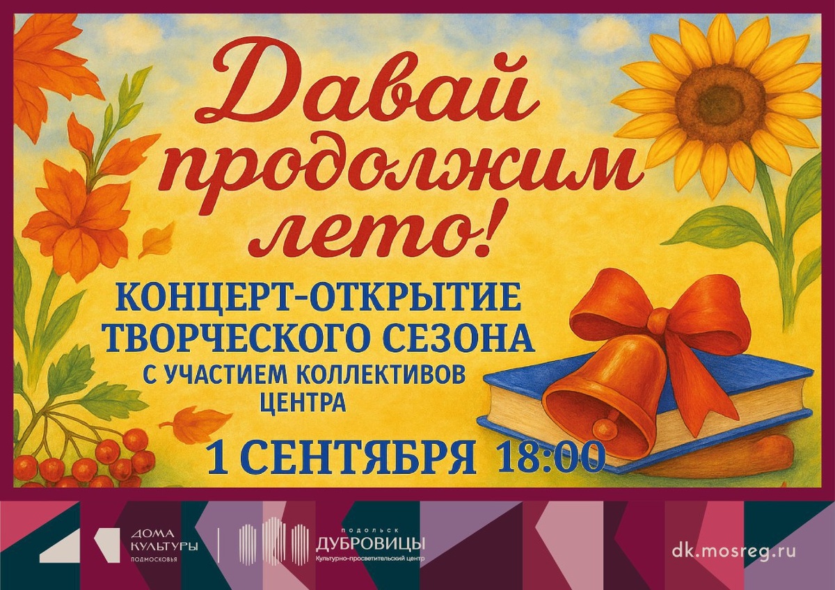 ✨ Концерт открытие творческого сезона «Давай продолжим лето!» 🎤👯В этом празднике примут участие все клубные формирования: хореографические, вокальные, театральные, инструментальные и любительские объединения. ⏳Продолжительность – 1 час 30 минут 🚫 Возраст: 3+ 📆 01.09.2025 🕒 18:00 🏢 Культурно-просветительский центр "Дубровицы" 📍 г.о. Подольск, поселок Дубровицы, д. 65А 💰 Вход свободный❗️ #webПодольск ⭐Поддержать канал голосом 💰 Вакансия - курьер в Подольске ✅ Мероприятия Подольск https://dzen.ru/id/66ed500f7b5671493eca3fd6 http://vk.com/podolsk_events http://dzen.ru/podolsk_events