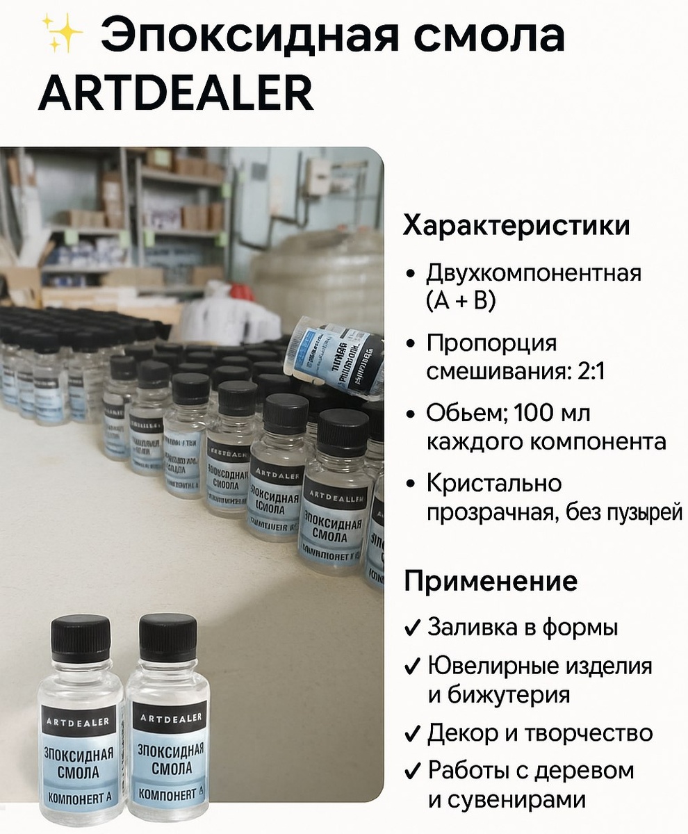 Сегодня показываем вам нашу эпоксидную смолу с отвердителем 💧 Это базовый материал для Resin Art, украшений, артбордов и декора. ✨ Что вы получаете: Прозрачную эпоксидную смолу с оптимальной вязкостью Отвердитель в комплекте Удобную упаковку с инструкцией прямо на этикетке Качество проверенное временем (мы на рынке с 2013 года) 🔥 Особенности: Минимум пузырьков при заливке Отличная текучесть и смешивание с пигментами Полное застывание — через 24 часа 🛒 Заказать смолу ArtDealer можно на Ozon: 👉 Эпоксидная смола ArtDealer --- #ArtDealer #СмолаArtDealer #ResinArt #ЭпоксиднаяСмола #Творчество #DIY #Handmade #РаспаковкаArtDealer