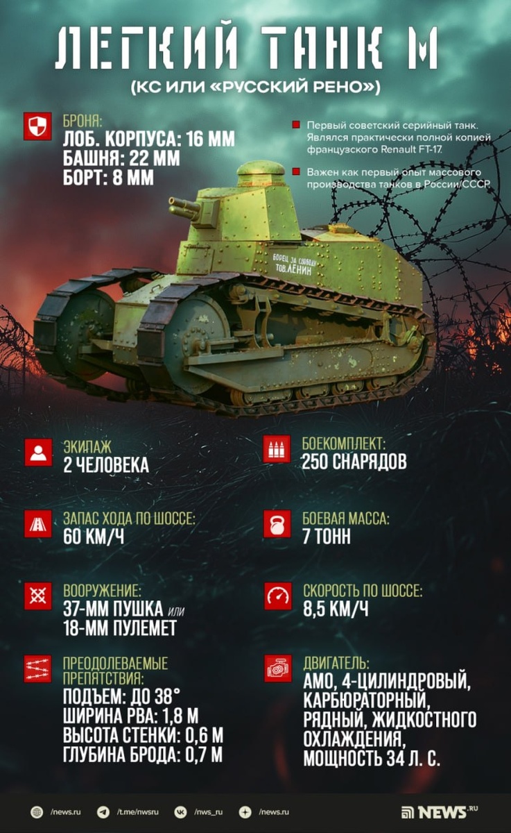 Сегодня исполняется 105 лет первому отечественному танку. 31 августа 1920 года принято считать началом эпохи отечественного танкостроения. В этот день на заводе «Красное Сормово» в Нижнем Новгороде провели испытания первого советского танка. 1 сентября будет проведено второе испытание и проба орудия». Боевая машина получила имя «Борец за свободу товарищ Ленин». Всего было выпущено 15 танков, среди которых — «Карл Маркс», «Лев Троцкий» и «Лейтенант Шмидт». Первый советский танк был модификацией французского Renault FT-17. Советская версия выпускалась в двух вариантах башни — круглой литой или восьмигранной клепаной, с пушкой Гочкиса калибра 37 мм или пулеметом того же производителя. В стране танк получил общее название «Русский Рено». ⭕️Подписаться | Мы в MAX | Буст