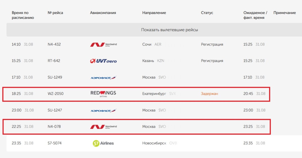 Самолет в Екатеринбург вылетит с опозданием на два часа, а самолет в Москву - с опозданием в час.