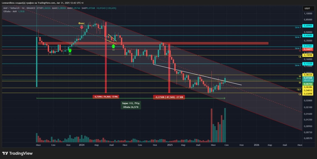 #инвест #MAV 🕯🕯🕯 ⚠️Недельный график, вырвался большей половины тела недельной свечи над важным уровнем + пробил среднесрочную трендовую. Движение в мощном глобальном нисходящем канале, выход из которого обеспечит достижение минимум 3й цели!! ⚠️На недельном графике RSI есть мощный дивер, после которого начался разворот, сейчас RSI в медленном плавном восхождении = о перепроданности и речи быть не может. Обратите внимание на объемы снизу = это недельный график, уверен понимаете, что это значит!! P.s. фундаментально проект из сферы DeFi, с сильнейшими партнерами, подробно найдете при желании. Как и большинство монет укатали цену в плинтус, выгребая снизу последние остатки у потерявших веру. Я уверен, что те цели которые вы видите на графике, это лишь разгон для основного прыжка. Такие объемы китами не выкупаются для 5-10 иксов!! HI цены при листинге на Binance уровень 1,98$, вот это и есть основная перспектива. Можно чекнуть закрытие месяца и понаблюдать следующую неделю на предмет