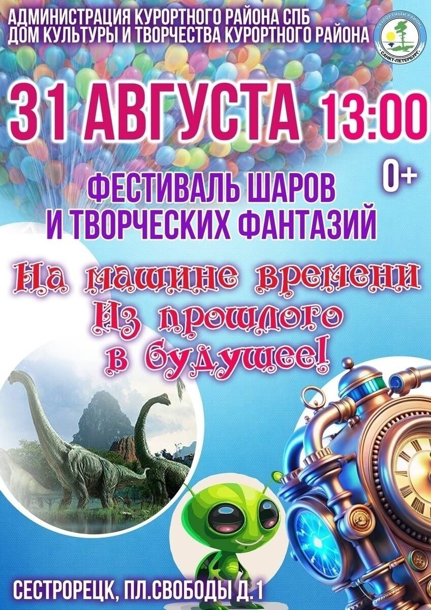 Сегодня в 13:00 в Сестрорецке начнется Фестиваль шаров и творческих фантазий. «В этом году участники программы отправятся на машине времени – из прошлого в будущее! Вас ждут удивительные приключения, встреча с динозаврами, путешествия к инопланетянам и много сюрпризов! Не пропустите семейный праздник! Приходите за отличным настроением и новыми впечатлениями!» – приглашает администрация Курортного района. Посетителей ждут игры, мастер-классы и настоящая атмосфера праздника для всей семьи. Мероприятие состоится по адресу: пл. Свободы, дом 1. Без возрастных ограничений. Ранее сообщалось, что большой концерт на Елагином острове в Петербурге завершил социально-благотворительный проект «Будь с городом!». Фестиваль проходил при поддержке Комитета по культуре Санкт-Петербурга.