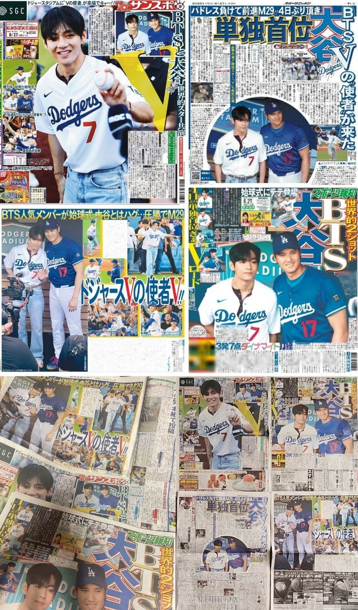 Церемония подачи мяча V из BTS для команды LA Dodgers украсила первые страницы пяти японских спортивных газет.