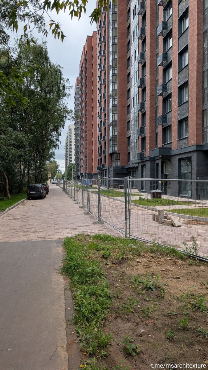Бехтерева, 25к1. Сегодня парочка непримечательных домов по реновации. Ниже, чем коммерческие через дорогу — плюс вайб. Фасад нормальный. Уютно смотрится пешеходная улица между новыми домами и старой пятиэтажной напротив, насколько важно озеленение. В первый раз ограждение детской площадки поликарбонатом выглядит разумно и даже немного архитектурно (по центру между корпусами). 📱 Архитекстура #Москва #реновация