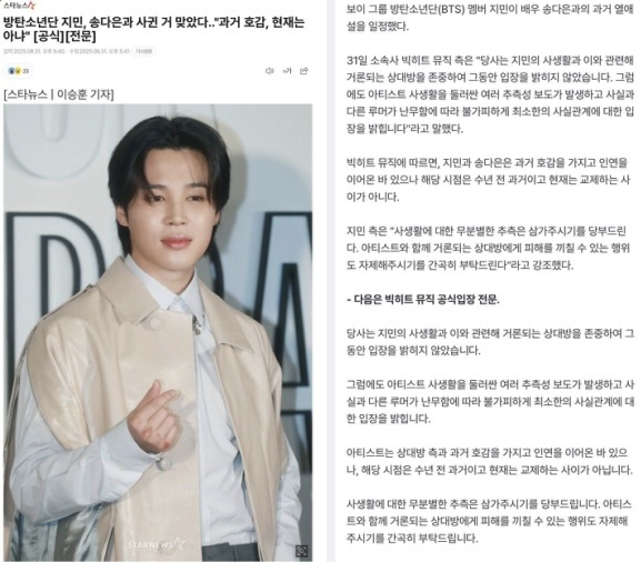 «Мы уважали личную жизнь Чимина и упоминаемого в связи с этим человека, поэтому до сих пор не делали официальных комментариев. Однако из-за множества догадок и распространения ложных слухов вокруг личной жизни артиста мы вынуждены прояснить минимальные фактические обстоятельства. Артист действительно испытывал симпатию к упоминаемому человеку и поддерживал с ним отношения в прошлом, но это было несколько лет назад, и сейчас они не встречаются. Мы настоятельно просим воздержаться от необоснованных домыслов о личной жизни. Также просим не совершать действий, которые могут причинить ущерб человеку, упоминаемому вместе с артистом».