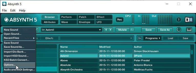 Absynth – синтезатор с уникальным звучанием. Последняя версия была выпущена в 2021 v5.3.4, а в 2022 году NI прекратила продажу и поддержку инструмента. В моем распоряжении версия v5.3.1 - 2015 года. Думается что в последующих версиях программа сильно не изменилась. Установка Absynth 5 выполняется согласно инструкции и с ней вопросов нет. А вот с настройкой звука есть нюансы. После установки синтезатор не находит свою библиотеку. Что делать? • Откроем standalone версию. В окне Absynth 5 выберем всплывающее меню File-Options… • В окне Options нужно перейти на вкладку 'Browser' и нажать кнопку 'Add' чтобы добавить новое расположение папки звуков
