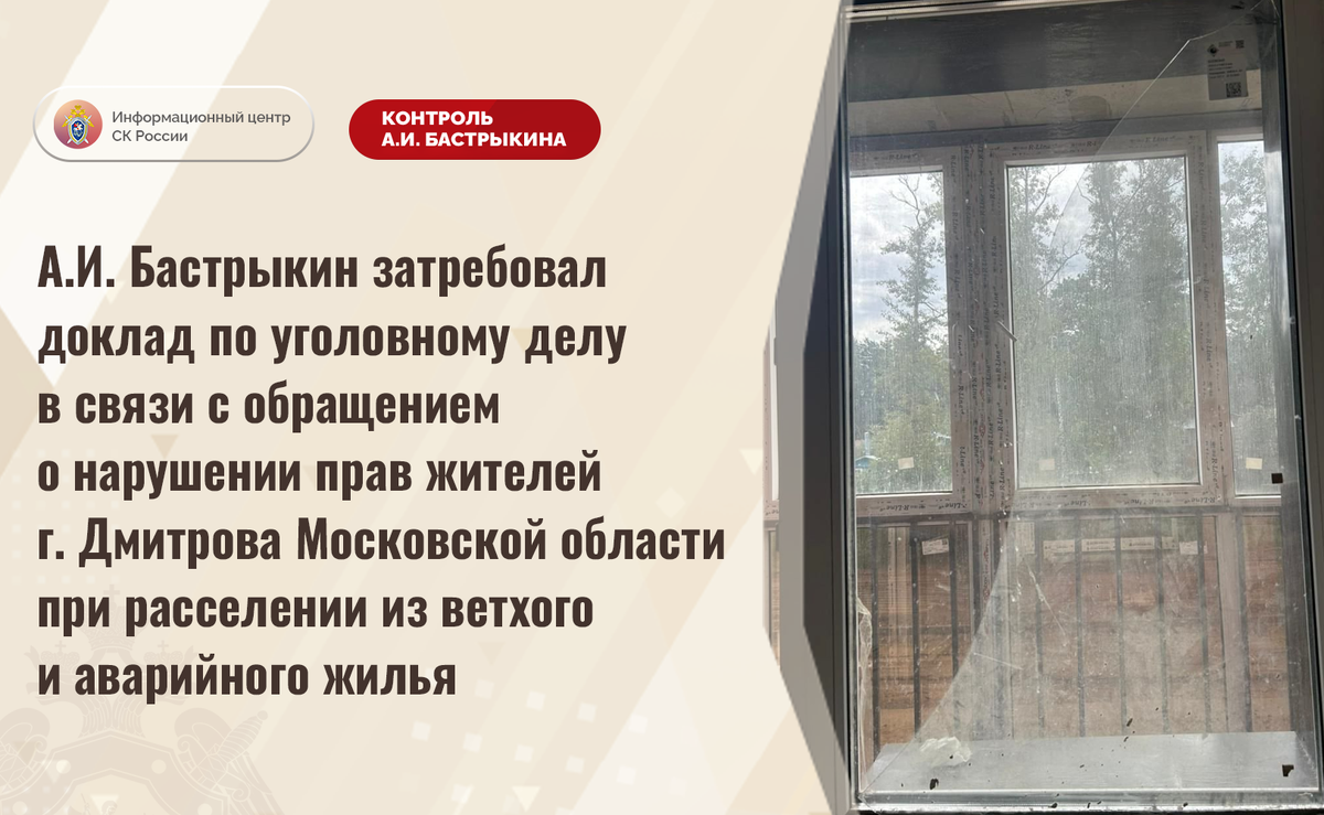 А.И. Бастрыкин затребовал доклад по уголовному делу в связи с обращением о нарушении прав жителей г. Дмитрова Московской области при расселении из ветхого и аварийного жилья В комментариях в социальной сети СК России размещено обращение по вопросу нарушения прав жителей города Дмитрова Московской области при расселении из ветхого и аварийного жилья. Граждан вынуждают переселиться в жилые помещения многоквартирного дома, введенного в эксплуатацию в августе текущего года с многочисленными нарушениями. Так, внутренние отделочные работы до настоящего времени не завершены, в стенах образовались трещины, оконное остекление и напольные покрытия повреждены. Обращения в компетентные органы результатов не принесли, мер к разрешению ситуации не принимается. В ГСУ СК России по Московской области возбуждено уголовное дело. Председатель Следственного комитета Российской Федерации Александр Иванович Бастрыкин затребовал у и.о. руководителя ГСУ СК России по Московской области Александра Юрьевича Шмыр