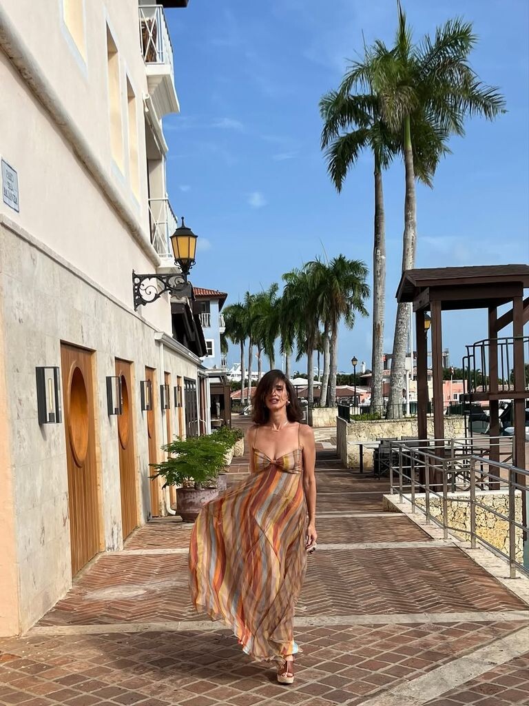 Испанская актриса Пас Вега использует последние дни лета для отдыха в Доминиканской Республике. 49-летняя звезда совмещает отпуск в эксклюзивном курортном месте Ла-Романа (La Romana) с работой над новым проектом, детали которого пока не разглашаются. Своими впечатлениями и стильными образами она активно делится с подписчиками в социальных сетях, демонстрируя приверженность испанским модным брендам. Центральным элементом одного из ее последних нарядов стало длинное платье на тонких бретелях от мадридской марки Is Coming. Модель под названием Striped Tulle Dress выполнена из тюля с подкладкой и украшена вышитыми разноцветными полосами с золотой нитью. Романтический крой с бантом на вырезе и легкий богемный стиль платья гармонично сочетаются с карибскими пейзажами. В настоящее время это изделие доступно со скидкой по цене 357 евро. Свой образ актриса дополнила лаконичными, но выразительными аксессуарами. Она выбрала солнцезащитные очки от Max Mara классической формы и эспадрильи на танкет